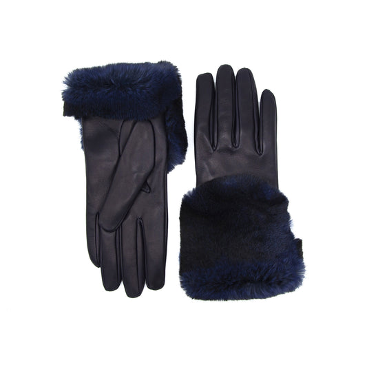 Women's blue nappa leather gloves with a wide real fur panel on the top and cashmere lined