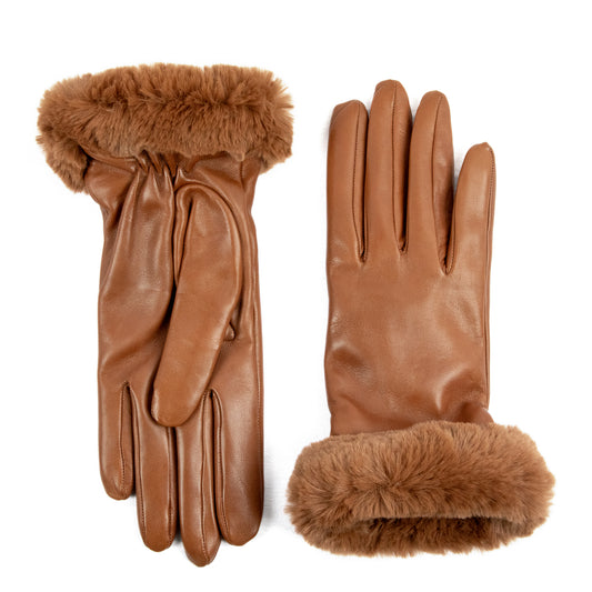 Women's camel nappa leather gloves with faux fur