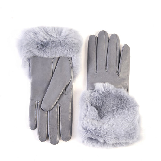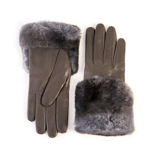 Women's grey nappa leather gloves with a wide real fur panel on the top and cashmere lined