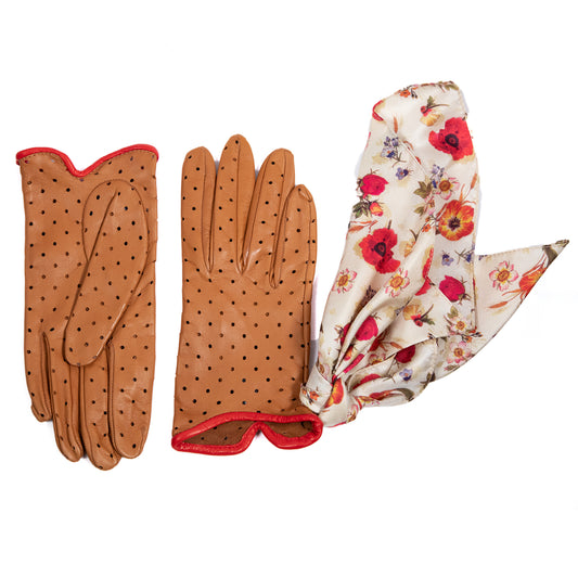 Guanti da donna sfoderati in nappa colore camel con dettaglio pois traforati