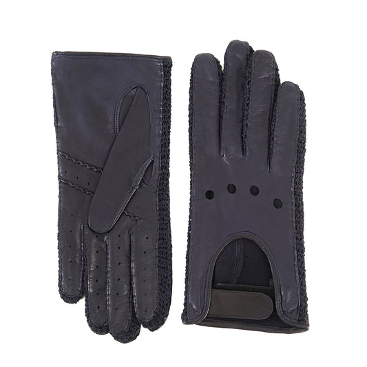 Guanti da donna da guida in nappa colore blu navy con trafori sulle nocche e inserti crochet