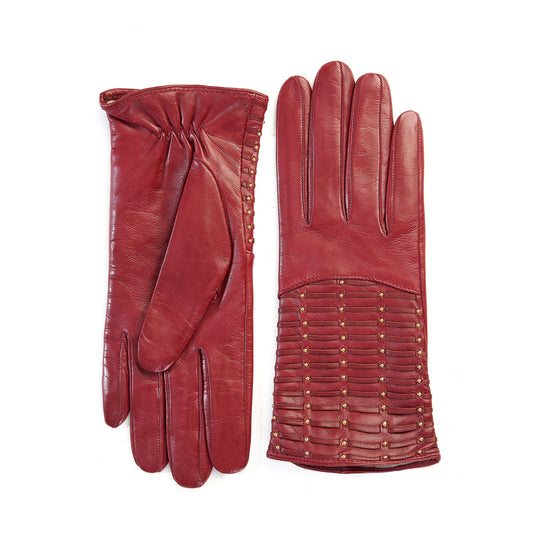 Guanti da donna in pelle nappa colore rum con borchie e pelle intrecciata lavorata a mano