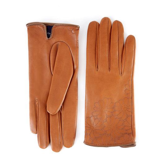 Guanti da donna sfoderati in nappa colore camel e con dettaglio floreale