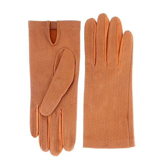 Guanti da donna sfoderati in nappa colore camel e con dettaglio trama tagliato a laser