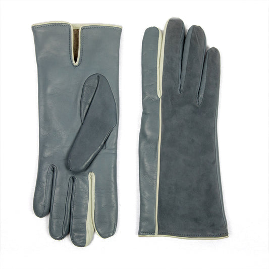 Guanti da donna con intreccio di nappa grigia e suede blu foderato misto cashmere