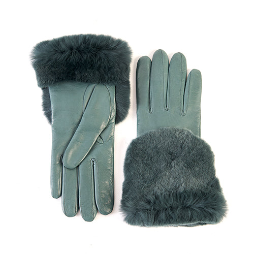 Guanti da donna in pelle nappa colore verde con pelliccia naturale e foderati in cashmere