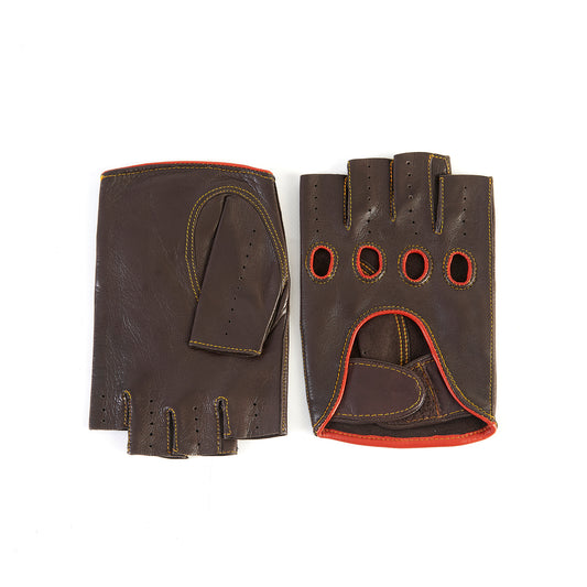Guanti da uomo da guida mezze dita in nappa colore marrone con chiusura con velcro