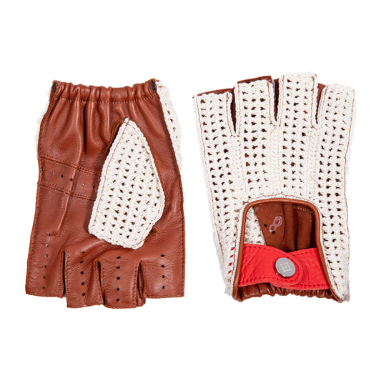 Guanti da uomo da guida mezze dita colore cognac con dorso in crochet e cinturino in pelle di cervo rossa