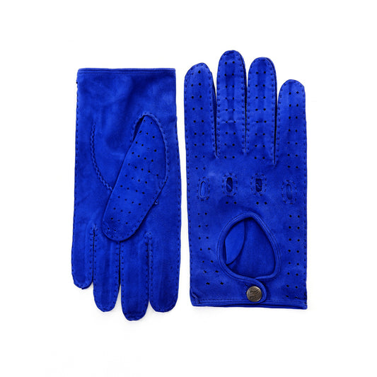 Guanti da guida da uomo sfoderati in pelle scamosciata cuciti a mano colore blu elettrico con chiusura con bottoni