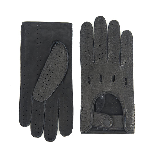 Guanti da guida da uomo sfoderati in pelle pecari nera con palmo in nabuck e chiusura con bottoni