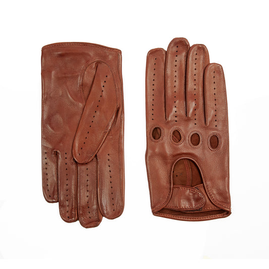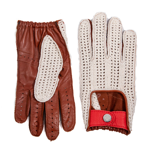 Guanti da uomo da guida in nappa color cognac con dorso in crochet e cinturino in pelle di cervo rossa