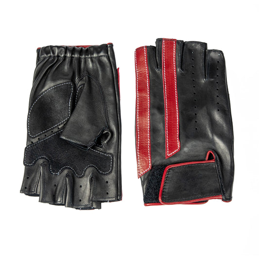 Guanti da uomo da guida mezze dita in nappa colore nero con strisce di pelle a contrasto rosso sfoderati
