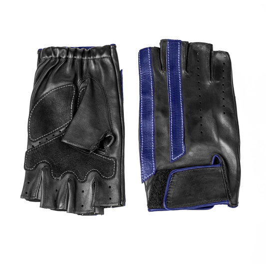 Guanti da uomo da guida mezze dita in nappa colore nero con strisce di pelle a contrasto blu sfoderati