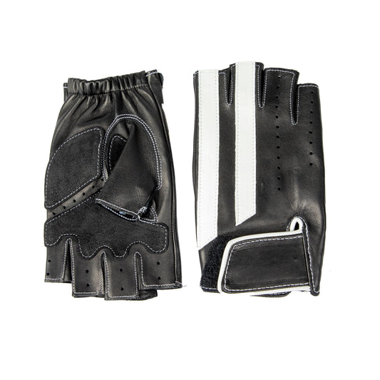 Guanti da uomo da guida mezze dita in nappa colore nero con strisce di pelle a contrasto bianco sfoderati