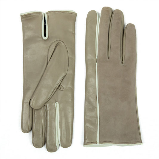 Guanti da donna in pelle nappa e suede colore tortora foderati in cashmere