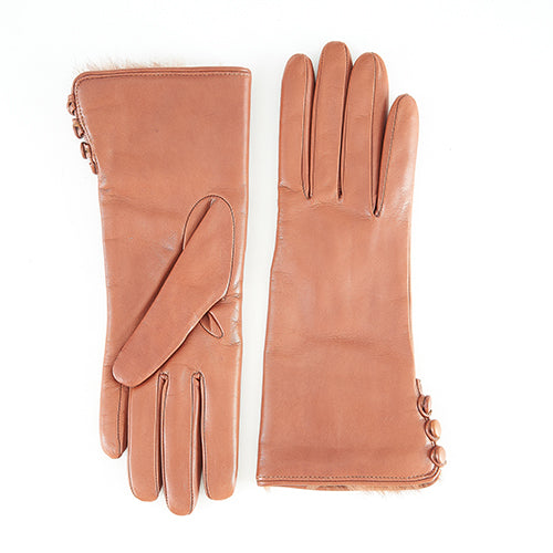 Guanti da donna in pelle nappa colore cognac, con polsino di lapin all'interno