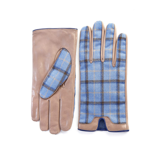 Guanti da uomo in pelle color alpaca e dorso in lana Holland&Sherry a quadretti blu chiaro con apertura sopramano