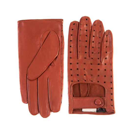 Guanti da uomo da guida in nappa laserata color cognac con cinturino