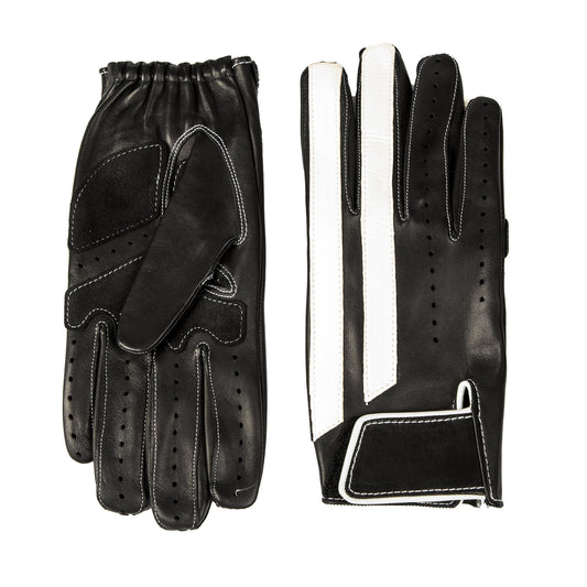 Guanti da uomo da guida in nappa colore nero con strisce di pelle a contrasto bianco sfoderati
