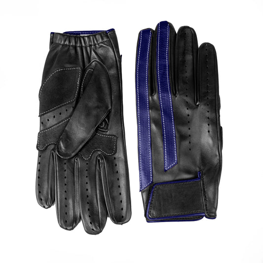 Guanti da uomo da guida in nappa colore nero con strisce di pelle a contrasto blu sfoderati