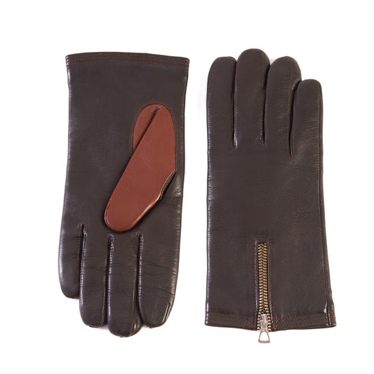 Guanti da uomo in nappa colore marrone con pollice e cuciture color cognac con zip e foderati cashmere