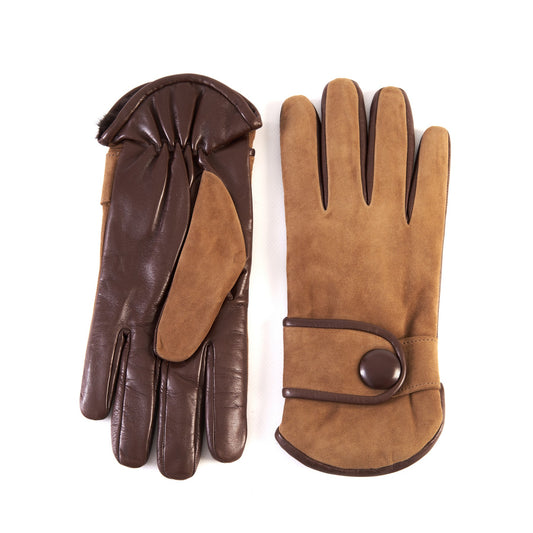 Guanti da uomo in pelle suede e nappa colore tabacco con bottone e foderati con pelliccia vera