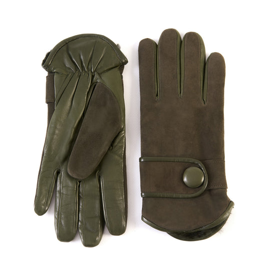 Guanti da uomo in pelle suede e nappa colore verde con bottone e foderati con pelliccia vera