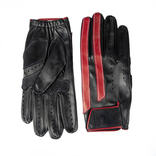 Guanti da uomo da guida in nappa colore nero con strisce di pelle a contrasto rosso sfoderati