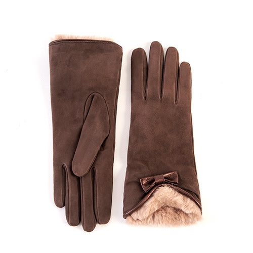 Guanti da donna in pelle suede con polsino in pelliccia di coniglio naturale, dettagli a fiocco