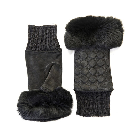 Manicotto nero di suede trapuntata con fodera di lana e pelliccia naturale