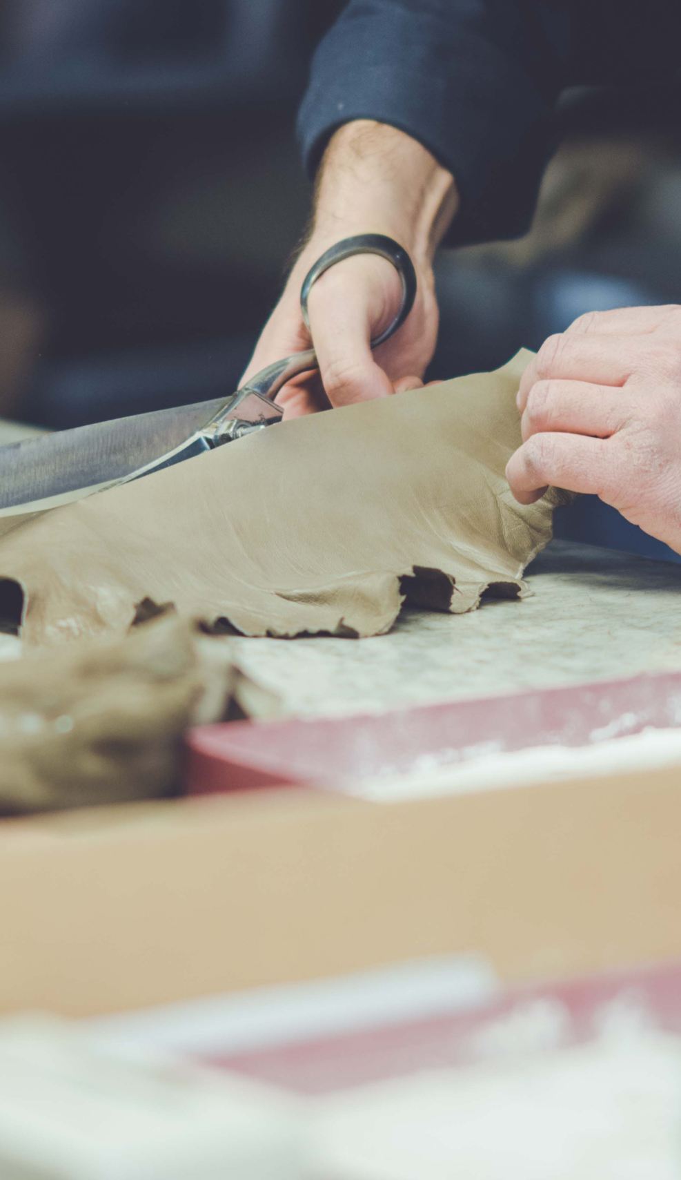 Altra fase molto delicata è il taglio della pelle che i mastri guantai Gala Gloves eseguono ancora con le forbici. La pelle scelta viene stesa ed esaminata con minuziosa attenzione dal tagliatore che potrà così valutare dove fare il taglio.