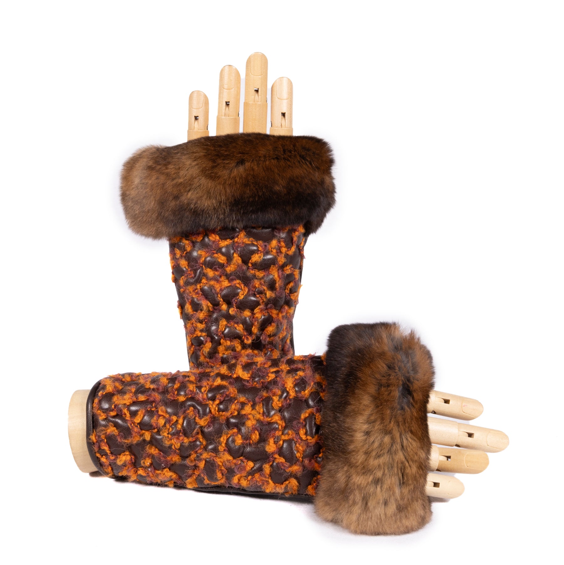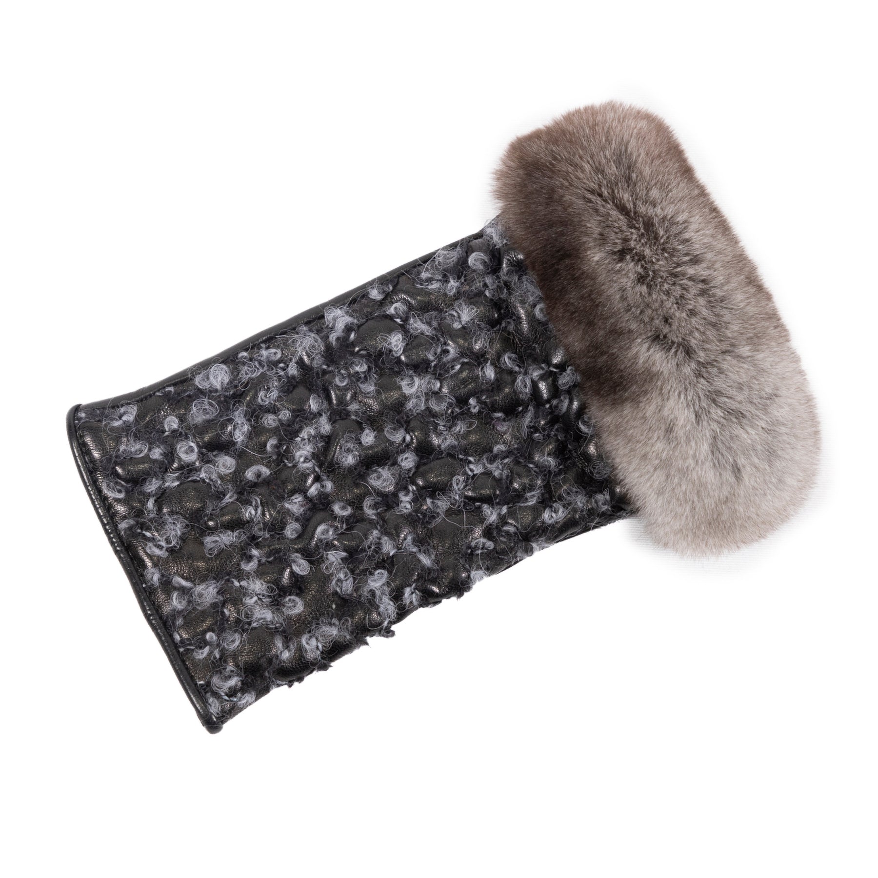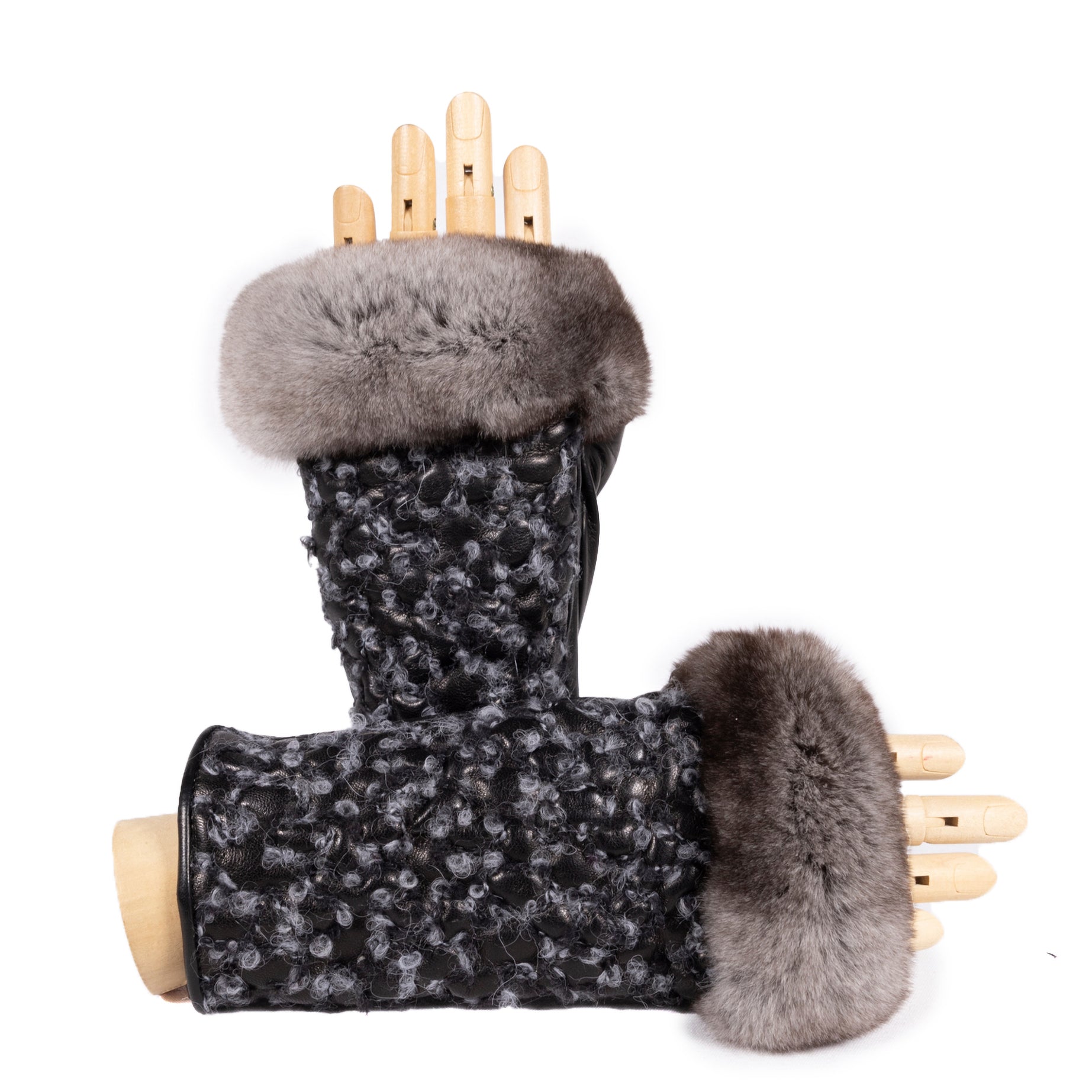 Esalta la tua eleganza con questi raffinati guanti senza dita realizzati in morbida nappa. Rifiniti con delicati dettagli in bouclè e pelliccia, offrono una texture ricca e un tocco di lusso. La fodera in cashmere offre calore e comfort  mentre la pelliccia di coniglio rex naturale sulla punta delle dita offre un dettaglio sofisticato e tattile.